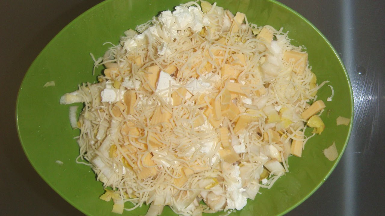This is The Husband’s attempt to cook. He made a salad. Or should I say, a cheese salad. There is like three or four different types of cheese in that with a little bit of endive at the bottom. God knows he tries. Bless him.Β