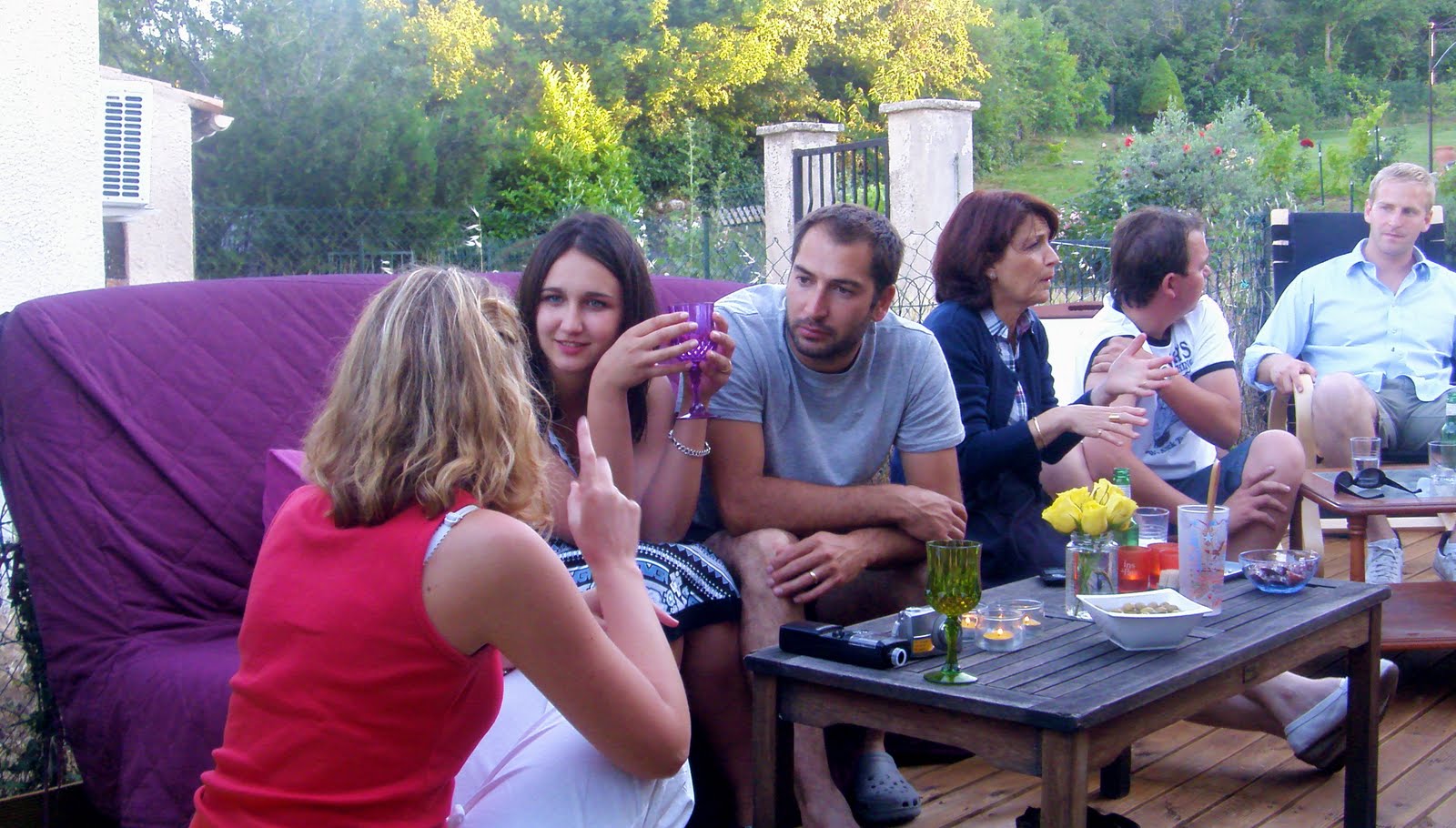 And here’s my lovely Irish friend engaged in conversation with Child Bride and Brother-in-Law (she doesn’t speak French, they don’t speak English, but whatever), Mrs Honey happy to have her Pina Colada back, Gatz, fresh from his nap with a clean face and a new t-shirt (don’t ask what happened to the other one) and the birthday boy himself, The Husband, overseeing it all, like the king he is.Â