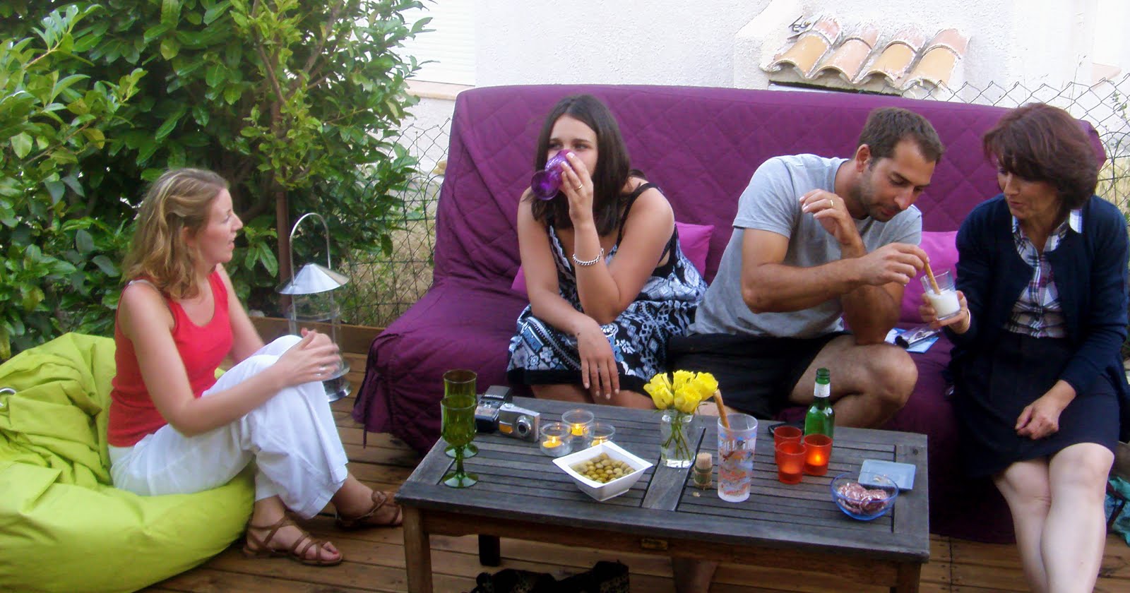 And here’s my lovely Irish friend engaged in conversation with Child Bride and Brother-in-Law (she doesn’t speak French, they don’t speak English, but whatever), Mrs Honey happy to have her Pina Colada back, Gatz, fresh from his nap with a clean face and a new t-shirt (don’t ask what happened to the other one) and the birthday boy himself, The Husband, overseeing it all, like the king he is.