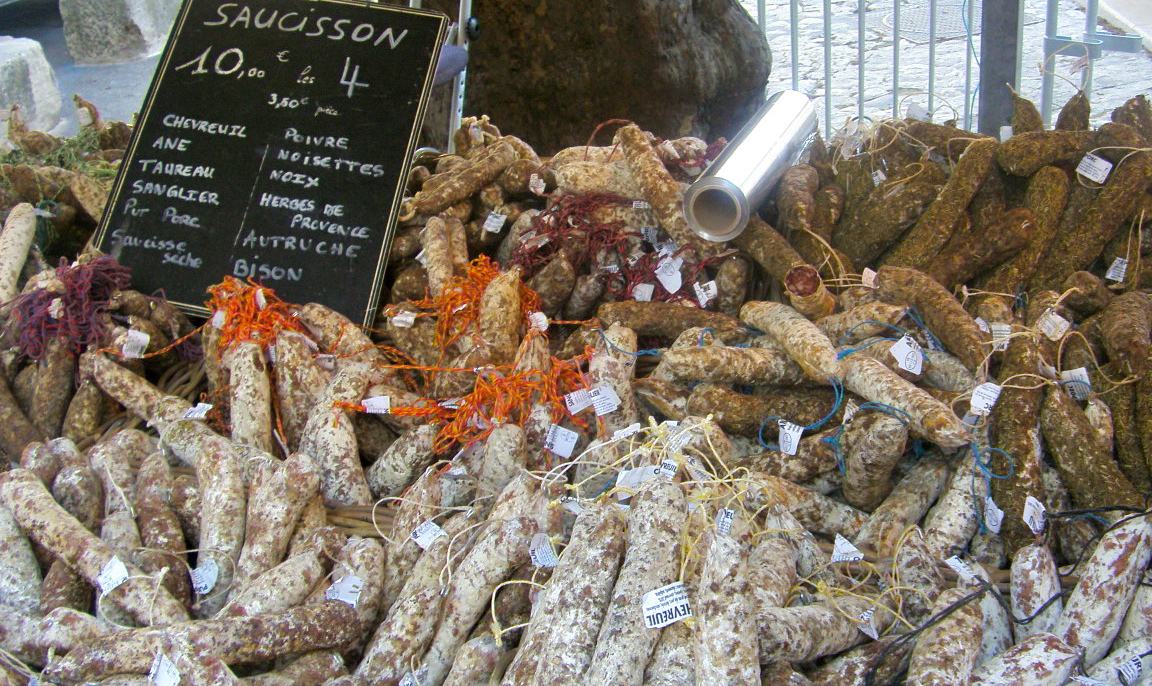 Miss Vicki and JoDelle had discovered some Provençal pottery that they just had to have. While they were buying up the shop, I bid adieu and went on my way exploring all of the pretty soaps, fragrant spices, olives and tampenades. And I bought some saucisson sec to treat Gregory; one olive, an herb, and a bleu d’Auvergne. (Just so you know, the bleu d’Auvergne saucisson with a glass of red wine is practically a revelation, it’s that good.)