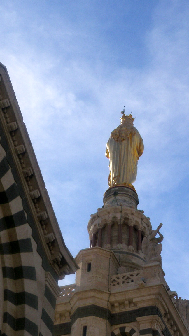 The Basilica, Notre Dame de la Garde, was consecrated in 1864 and is topped by a 27 foot copper and gold leaf statue of Madonna and child. Perched on the highest spot in Marseille, both the Neo-Byzantine architecture and the views from it are absolutely breathtaking and a must see if you are in the Marseille area.