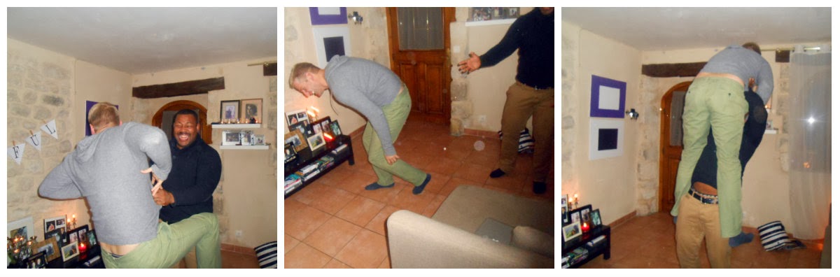 Despite the Thanksgiving activities table I set up during apéro (complete with American flag banner and napkins sent by Mommy London), Gregory and Mr.London still managed to get up to their usual shenanigans; wrestling, cuddling, busting out a BB gun, you know the usual. (Oh and in the interest of full disclosure, the previous evening’s wrestling match was so intense, Mr. London had a pair of perfectly good trousers ripped. They’re really nothing but overgrown children.)