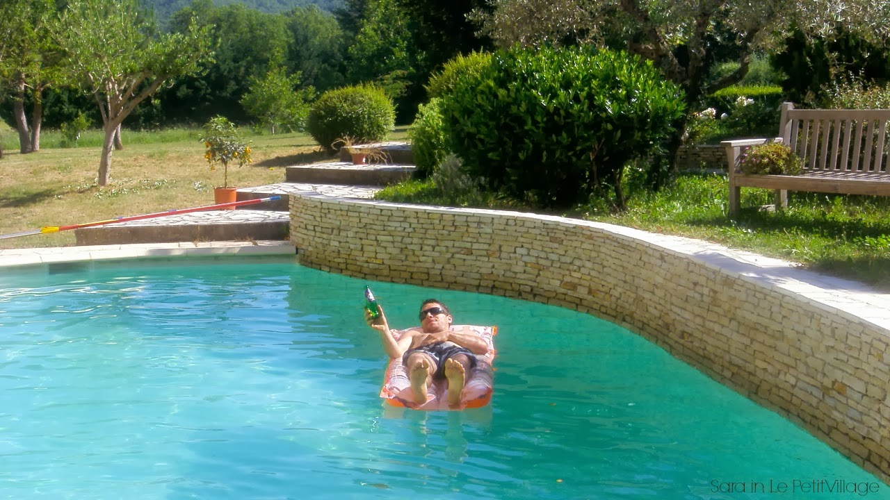 Ahhh… summer in Provence. There are few things that make my heart sing the way summer in Provence does. Le Petit Village comes alive with the sun and we all move outside in celebration. (The following photos are from Summer 2010.)Here’s me celebrating the arrival of the season as it should be, with Rosé. I look happy. This photo was taken at a restaurant in the nearby village of Cereste. I had only returned from two weeks in Dublin the day before and I was anxious to feel the sun beating down on me. See that white watch on my wrist? I bought it on the airplane on the way back to France. Just thought I’d throw that out there.Here I am, happy again. This time I’m with Brother-in-Law, Child Bride and Gregory. It was Gregory’s birthday. I feel like we all look a lot younger here. I also feel like I got a little heavy handed with the Touche Eclat.And here’s Monsieur Fifty celebrating his daddy’s birthday. Doesn’t he look dapper? He’s smiling.Here’s a little ‘Behind the Photos’ trivia for you… Fifty thinks he’s a lapdog. It was easily forgiven when he was a pup like in this photo, but not so much now. It still doesn’t stop him from curling into an available lap whenever the opportunity presents itself.He also thinks he’s a rugby player. Here’s Fifty playing with Vicky against Gregory. These were great days… Gregory would take Fifty and Vicky out to the field in the village (well he’d take Fifty and of course Vicky would show up), and they’d run around for an hour. They’d be tuckered out for the rest of the afternoon and I’d get some peace. Bliss.